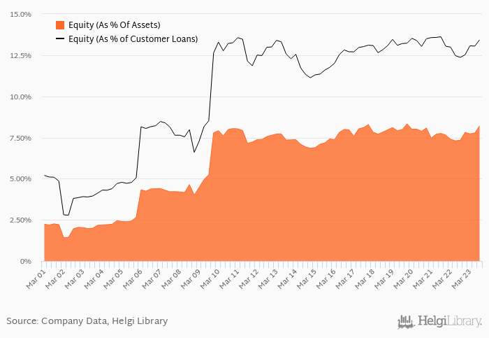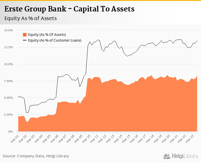 Erste Group Bank's Equity reached 8.21% of total assets in the 3Q2023, up from 7.33% for the previous year. As a share of net customer loans, the ratio amounted to 13.4% at the end of the third quarter of 2023.