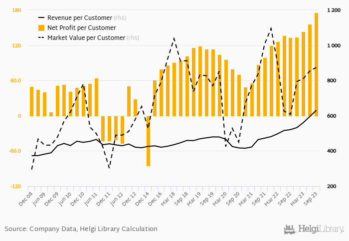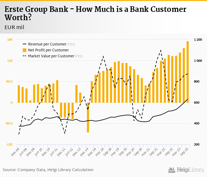 When putting together, the bank generated average revenues of EUR 631 per customer and achieved a net profit of EUR 176 per customer in 3Q2023. That's is 0% more than a decade ago in revenues and 0% more in terms of profit per customer.