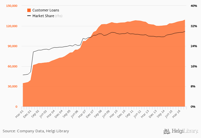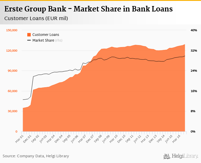 Erste Group Bank accounted for 29.8% of all customer loans issued in Austria at the end of 2016-09-30. Historically, the bank’s market share in customer loans reached an all time high of 29.8% in 2016-09-30 and an all time low of 12.6% in 2001-03-31.