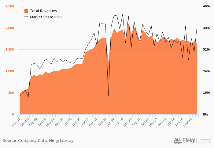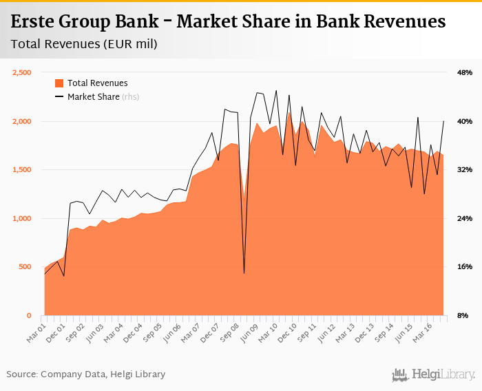 As a result, Erste Group Bank accounted for 40.0% of all bank revenues generated by banks in Austria in 2016-09-30. Historically, the bank’s market share in total revenues reached an all time high of 45.0% in 2010-03-31 and an all time low of 14.4% in 2001-12-31.