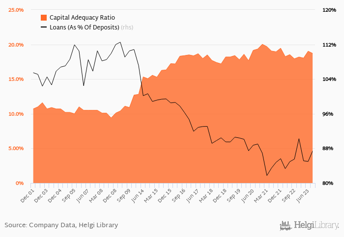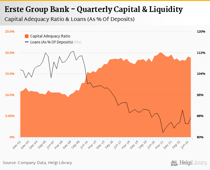 Erste Group Bank's capital adequacy ratio reached 18.7% at the end of third quarter of 2023, down from 19.0% when compared to the previous quarter. Historically, the bank’s capital ratio hit an all time high of 20.0% in 4Q2020 and an all time low of 9.40% in 3Q2008.