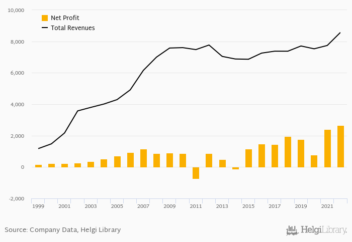 On the other hand, bank’s revenues amounted to an all time high of EUR 8,571 mil in 2022 and an all time low of EUR 1,172 mil in 1999. The average revenues in the last five years reached EUR 7,786 mil.