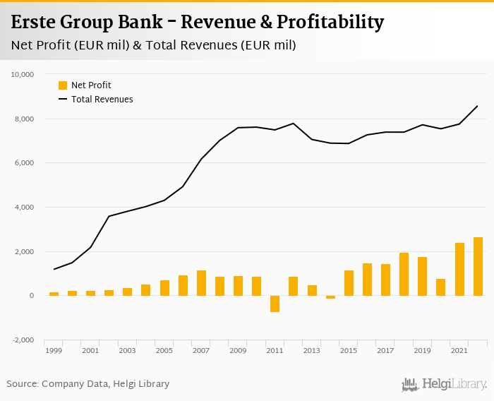 Comparing Erste Group Bank with its closest peers, Raiffeisen Bank Int. generated a net profit of EUR 3,797 mil with revenues of EUR 9,710 mil in 2022 and PKO BP netted EUR 3,333 mil (revenues of EUR 17,272 mil).