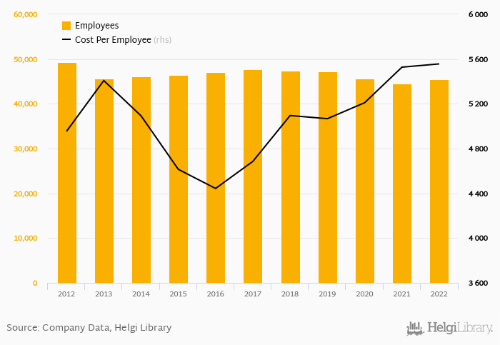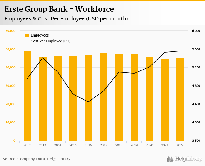 Erste Group Bank employed 45,485 persons in 2022, up 1.99% when compared to the previous year. Historically, the bank's workforce hit an all time high of 49,381 persons in 2012 and an all time low of 44,596 in 2021.