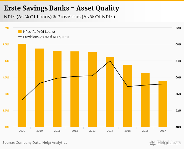 Erste Savings Banks's non-performing loans reached 4.17% of total loans at the end of 2017, down from 4.88% compared to the previous year. Historically, the NPL ratio hit an all time high of 7.55% in 2009 and an all time low of 4.17% in 2017.