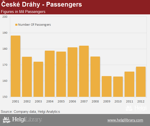 Ceske Drahy tranported nearly 169 mil passengers in 2012, down from more than 188 mil transported in 2001.