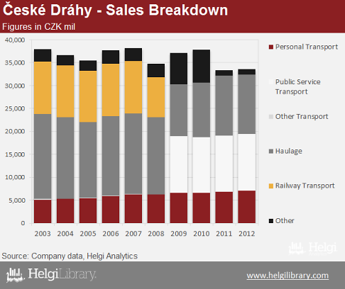 While Ceske Drahy's total revenues dropped 11% since 2003, personal transport (including revenues from the public service) has increased by 19%. At the end of 2012, personal transport represented 58% of Company's total revenues.