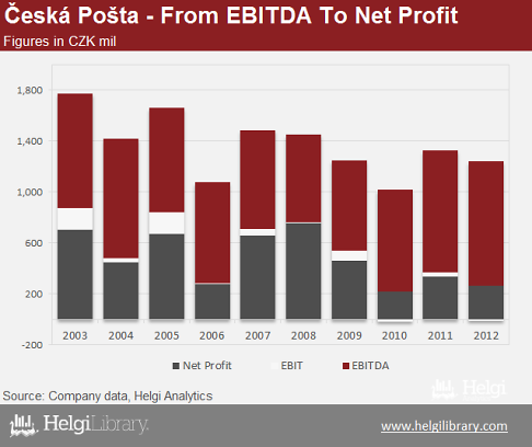 While total revenues of Ceska Posta have been stable at around USD 1 bil in the last five years, net profit of the Company fell by two thirds since 2008. In 2012, the net profit of Ceska Posta reached CZK 261 mil only, or 1.3% of annual sales.