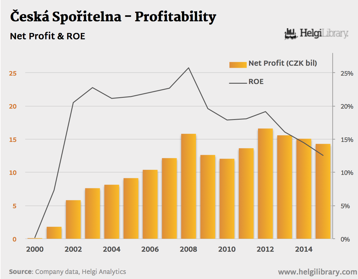 Since the takeover, Česká Spořitelna's net profit has increased dramatically and the average ROE reached nearly 19% in between 2006-2015. The bank is well capitalised (with a capital adequacy ratio exceeding 21%) and very well funded (with loans to deposits at only 75%) and has been lending cautiously since its privatisation (non-performing loans accounted for only 4.1% of total at the end of 2015).