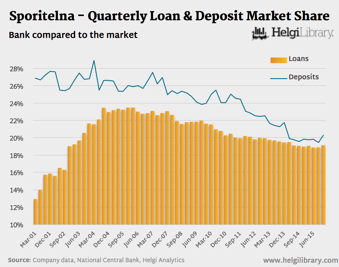 Česká Spořitelna - Quarterly Market Share in Loans & Deposits (Mar01-Dec15)