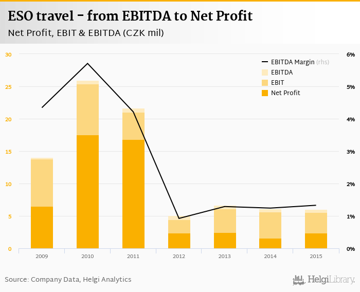 ESO travel made a net profit of CZK 2.35 mil with revenues of CZK 454 mil in 2015, up by 51.7% and down by 7.48%, respectively, compared to the previous year. This translates into a net margin of 0.518%.