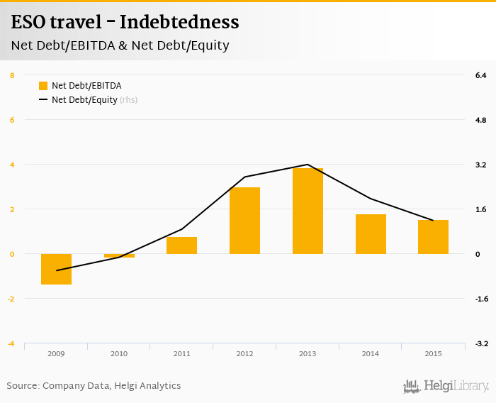 ESO travel's net debt stood at CZK 9.25 mil and accounted for 1.17 of equity at the end of 2015. The ratio is down 0.785 pp compared to the previous year.