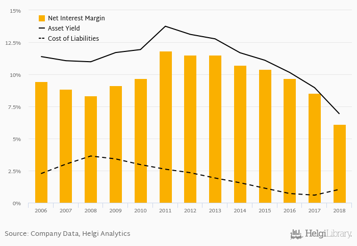 Historically, the bank’s net interest margin reached an all time high of 11.8% in 2011 and an all time low of 6.12% in 2018. The average margin in the last five years amounted to 9.09%.