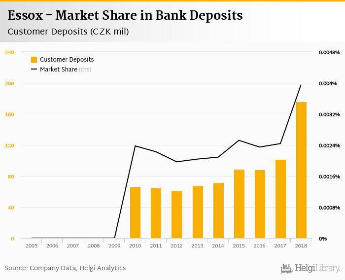 Essox accounted for 0.004% of all customer deposits taken by banks in Czechia at the end of 2018. Historically, the bank’s market share in customer deposits reached an all time high of 0.004% in 2018 and an all time low of 0% in 2005.
