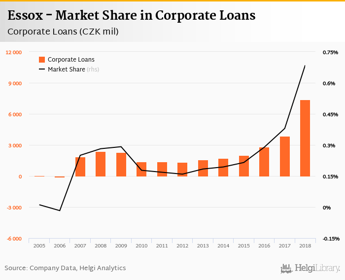 Essox's corporate loans reached CZK 7,400 mil in 2018, up 90.7% compared to the previous year.