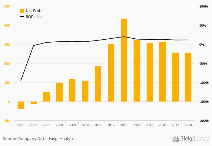 Historically, the bank’s net profit reached an all time high of CZK 648 mil in 2013 and an all time low of CZK -58.3 mil in 2005. The average profit in the last five years amounted to CZK 438 mil.