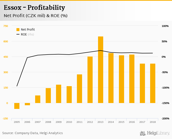 Essox made a net profit of CZK 383 mil in 2018, down 0.331% compared to the previous year. This implies a return on equity of 11.1%.