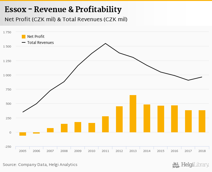 Essox made a net profit of CZK 383 mil under revenues of CZK 961 mil in 2018, up -0.331% and 6.35% respectively compared to the previous year.
