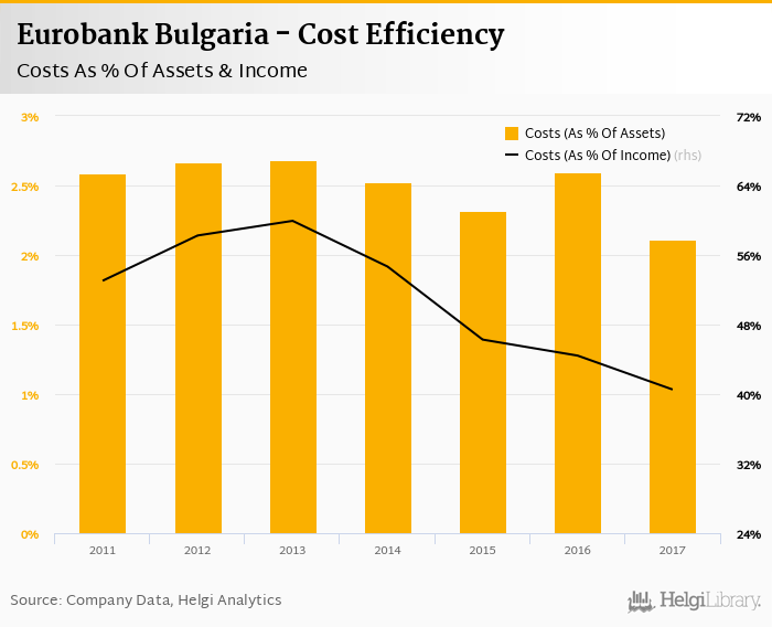 Comparing Eurobank Bulgaria with its closest peers, DSK Bank operated in 2017 with a cost to income ratio of 48.0% in 2017, United Bulgarian Bank reached 51.5% and Raiffeisenbank Bulgaria some 54.8%.