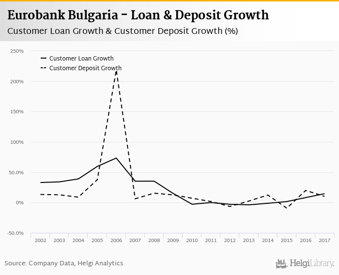 Eurobank Bulgaria's customer loan growth reached 14.6% in 2017, up from 8.18% compared to the previous year. Historically, the bank’s loans growth reached an all time high of 73.3% in 2006 and an all time low of -3.78% in 2013. In the last decade, the average annual loan growth amounted to 5.80%.