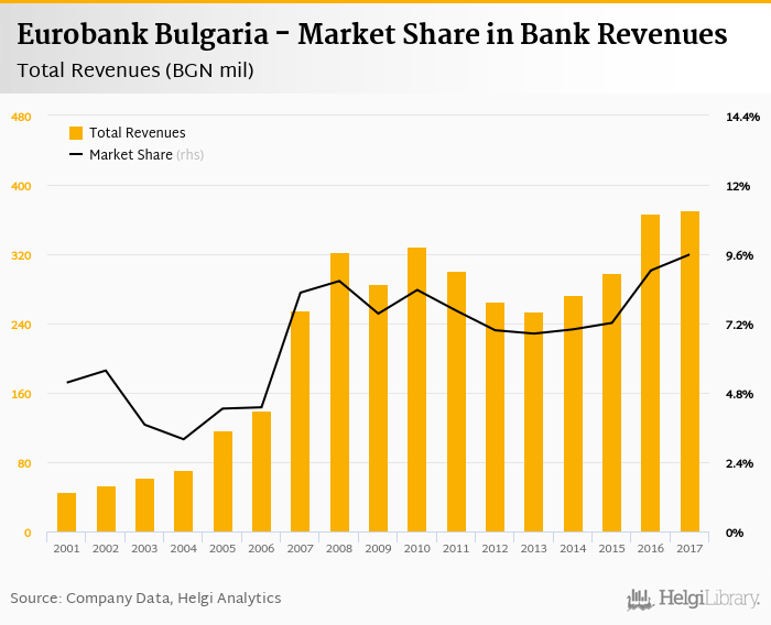 As a result, Eurobank Bulgaria accounted for 9.59% of all bank revenues generated by banks in Bulgaria in 2017. Historically, the bank’s market share in total revenues reached an all time high of 9.59% in 2017 and an all time low of 3.19% in 2004.