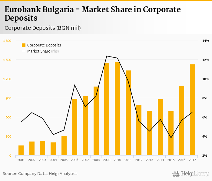 Eurobank Bulgaria accounted for 6.49% of all corporate deposits taken by banks in Bulgaria at the end of 2017. Historically, the bank’s market share in corporate deposits reached an all time high of 12.4% in 2009 and an all time low of 3.82% in 2015.