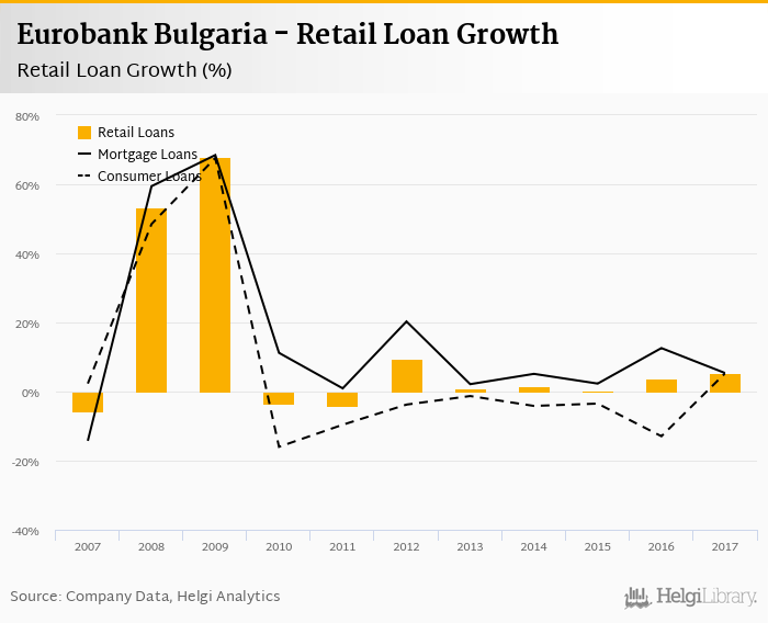 Mortgage loans rose 5.35% to BGN 1,579 mil in 2017 and accounted for 70.9% of the retail loan portfolio.