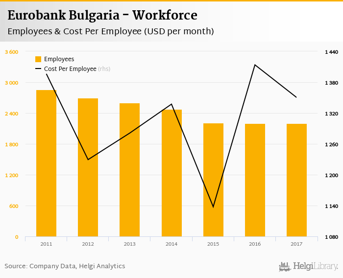 Comparing Eurobank Bulgaria with its closest peers, DSK Bank had 4,872 employees and 367 branches in 2017, United Bulgarian Bank operated with 2,600 people and 190 branches and Raiffeisenbank Bulgaria had a network of 134 branches with 2,711 employees in 2017.