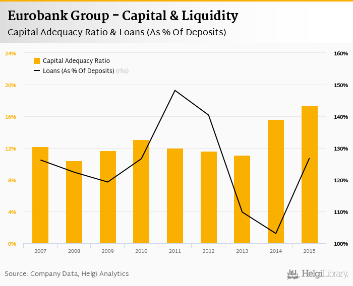 Comparing Eurobank Group with its closest peers, National Bank of Greece ended the year 2015 with a capital adequacy ratio at 14.6% and loans to deposits of 106%, Piraeus Bank Group with 17.5% and 130% respectively and Alpha Bank Group some 16.8% in terms of capital adequacy and 147% of loans to deposits at the end of 2015.