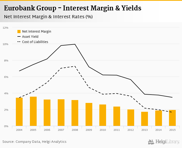 Comparing Eurobank Group with its closest peers, National Bank of Greece operated in 2015 with a net interest margin of 1.68% in 2015, Piraeus Bank Group reached 2.12% and Alpha Bank Group some 2.72%.