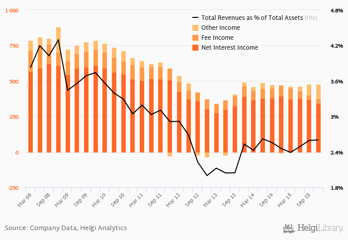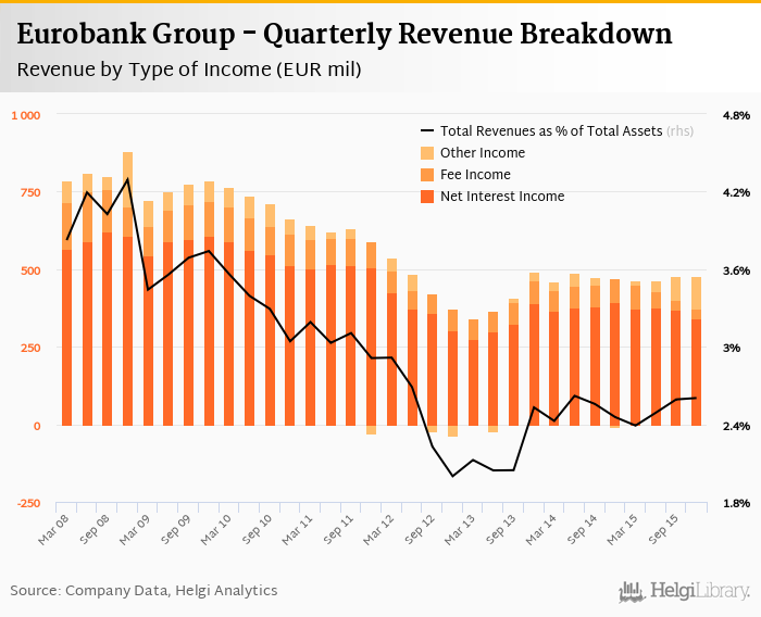 When compared to bank's main peers, National Bank of Greece generated total revenues of 1.88% of assets in 4Q2015 Piraeus Bank Group operated with 2.76% revenue margin and Alpha Bank Group produced total income worth 3.67% of assets.