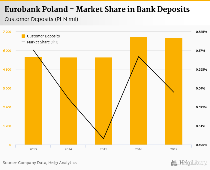 Eurobank Poland accounted for 0.537% of all customer deposits taken by banks in Poland at the end of 2017. Historically, the bank’s market share in customer deposits reached an all time high of 0.570% in 2013 and an all time low of 0.500% in 2015.