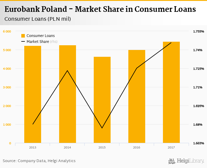 Eurobank Poland accounted for 1.75% of all consumer loans issued in Poland at the end of 2017. Historically, the bank’s market share in consumer loans reached an all time high of 1.75% in 2017 and an all time low of 1.68% in 2015.