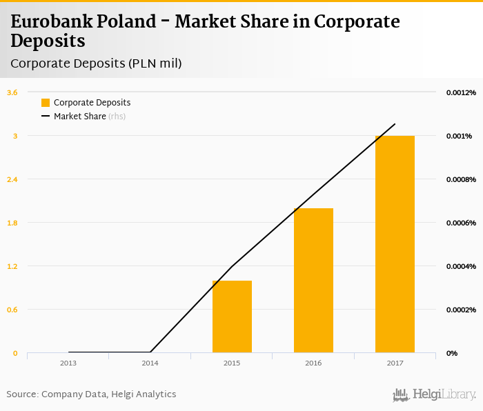 Eurobank Poland accounted for 0.001% of all corporate deposits taken by banks in Poland at the end of 2017. Historically, the bank’s market share in corporate deposits reached an all time high of 0.001% in 2017 and an all time low of 0% in 2013.