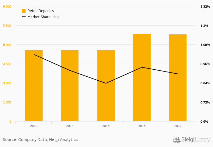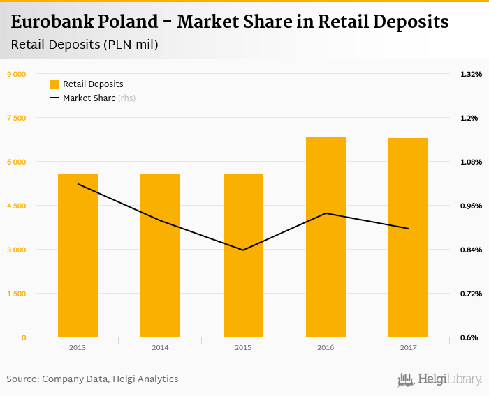 Eurobank Poland accounted for 0.895% of all retail deposits taken by banks in Poland at the end of 2017. Historically, the bank’s market share in retail deposits reached an all time high of 1.02% in 2013 and an all time low of 0.837% in 2015.