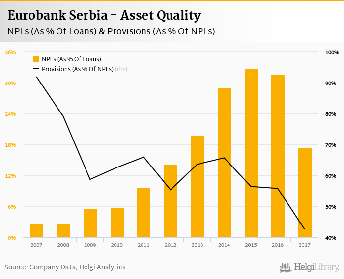 Comparing Eurobank Serbia with its closest peers, Komercijalna Banka Beograd operated at the end of 2017 with NPL ratio of 15.7% and provision coverage of 69.4%, Bank Intesa Serbia with 9.25% and 51.5% respectively and Raiffeisenbank Serbia had 4.74% of bad loans covered with 95.5% by provisions at the end of 2017.