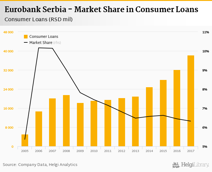 Eurobank Serbia accounted for 6.32% of all consumer loans issued in Serbia at the end of 2017. Historically, the bank’s market share in consumer loans reached an all time high of 10.2% in 2006 and an all time low of 5.35% in 2005.