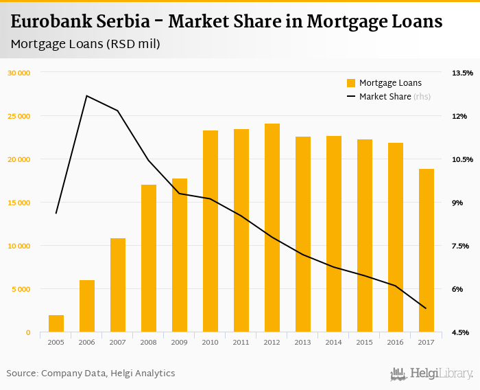 Eurobank Serbia accounted for 5.30% of all mortgage loans issued in Serbia at the end of 2017. Historically, the bank’s market share in mortgage loans reached an all time high of 12.7% in 2006 and an all time low of 5.30% in 2017.