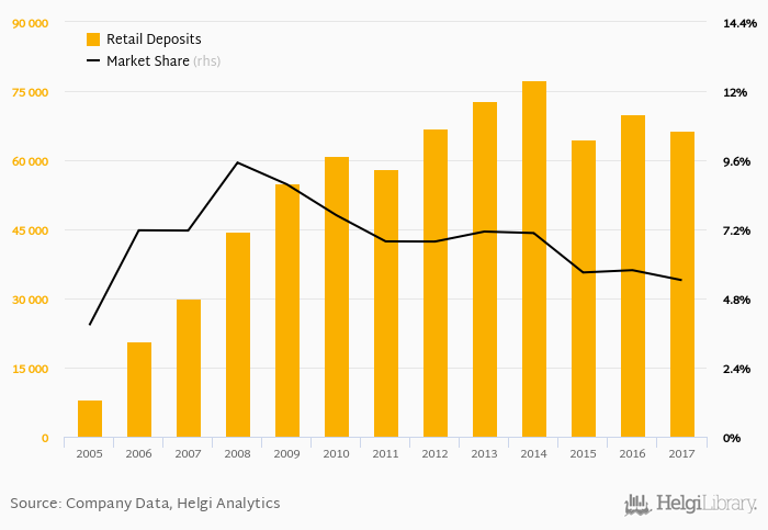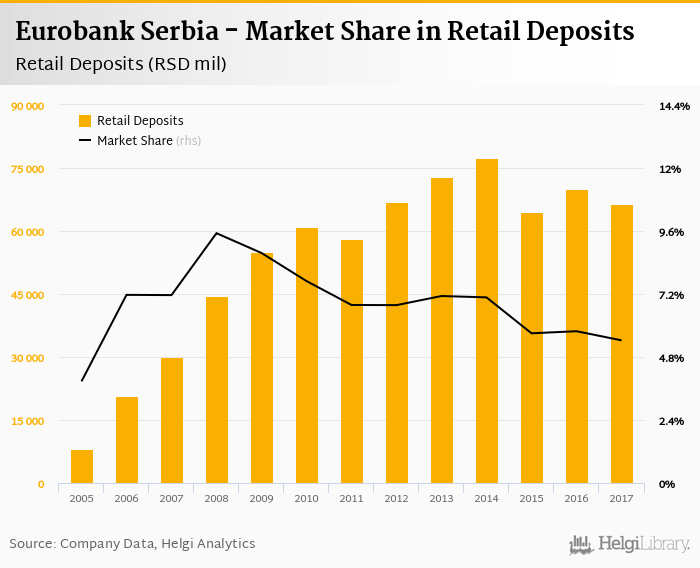 Eurobank Serbia accounted for 5.44% of all retail deposits taken by banks in Serbia at the end of 2017. Historically, the bank’s market share in retail deposits reached an all time high of 9.52% in 2008 and an all time low of 3.87% in 2005.