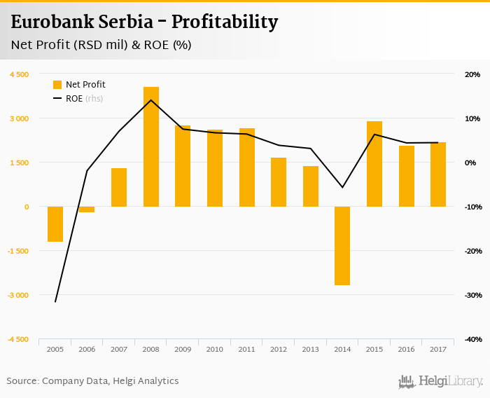 Comparing Eurobank Serbia with its closest peers, Komercijalna Banka Beograd generated a net profit of RSD 8,268 mil with ROE of 13.9% in 2017, Bank Intesa Serbia netted RSD 11,848 mil (ROE of 9.75%) and Raiffeisenbank Serbia announced a net profit of RSD 6,627 mil implying ROE of 11.7%.