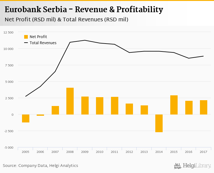 Comparing Eurobank Serbia with its closest peers, Komercijalna Banka Beograd generated a net profit of RSD 8,268 mil with revenues of RSD 20,035 mil in 2017, Bank Intesa Serbia netted RSD 11,848 mil (revenues of RSD 30,089 mil) and Raiffeisenbank Serbia announced a net profit of RSD 6,627 mil (revenues of RSD 15,542 mil).