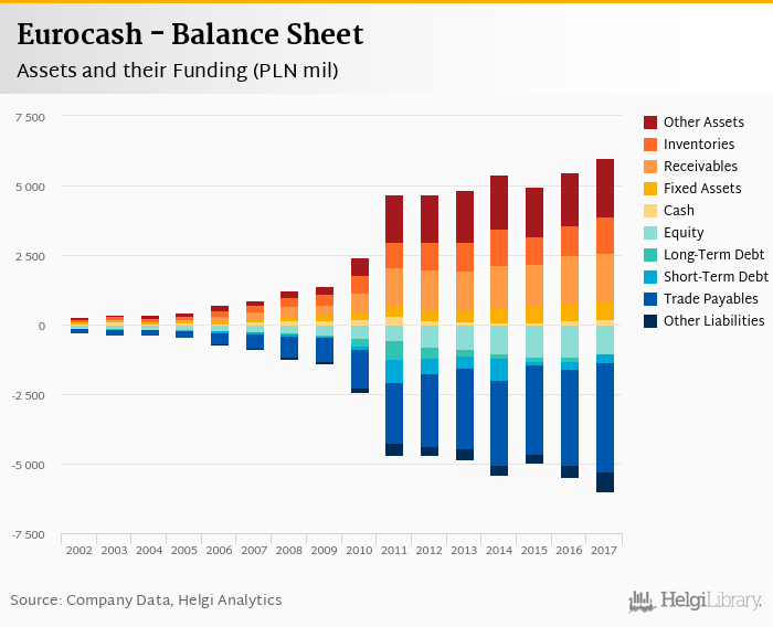 Current assets amounted to PLN 3,453 mil, or 57.7% of total assets while cash stood at PLN 203 mil at the end of 2017.