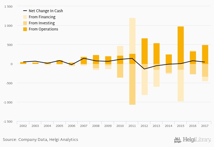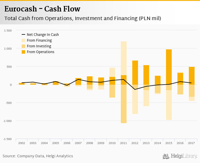 Cash from financing amounted to PLN -117 mil, so the company generated PLN 40.7 mil net cash in 2017.