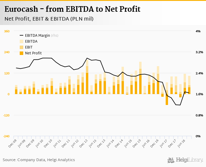 Eurocash made a net profit of PLN 38.2 mil with revenues of PLN 6,256 mil in 3Q2018, up by 6.11% and up by 8.33%, respectively, compared to the previous year. This translates into a net margin of 0.296%.