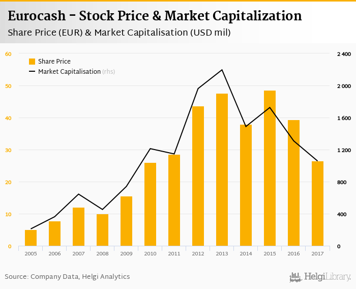 Eurocash stock traded at EUR 26.5 per share at the end 2017 implying a market capitalization of USD 1,057 mil.