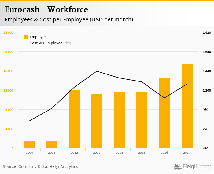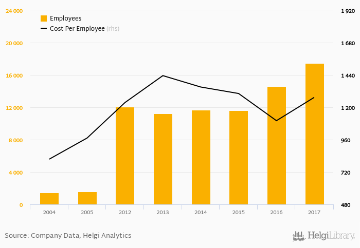 Eurocash employed 17,478 employees in 2017, up 19.5% compared to the previous year. Historically, between 2004 and 2017, the firm's workforce hit a high of 17,478 employees in 2017 and a low of 1,438 employees in 2004.