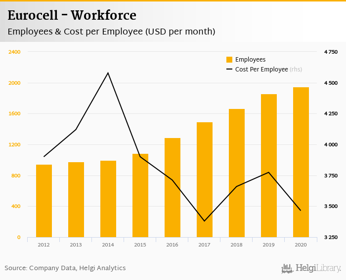 Eurocell employed 1,945 employees in 2020, up 4.85% compared to the previous year. Historically, between 2012 and 2020, the firm's workforce hit a high of 1,945 employees in 2020 and a low of 947 employees in 2012.