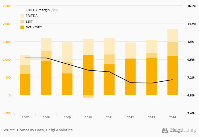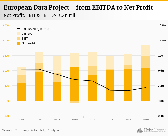 European Data Project made a net profit of CZK 1,105 mil with revenues of CZK 27,049 mil in 2014, up by 6.63% and up by 11.2%, respectively, compared to the previous year. This translates into a net margin of 4.08%.