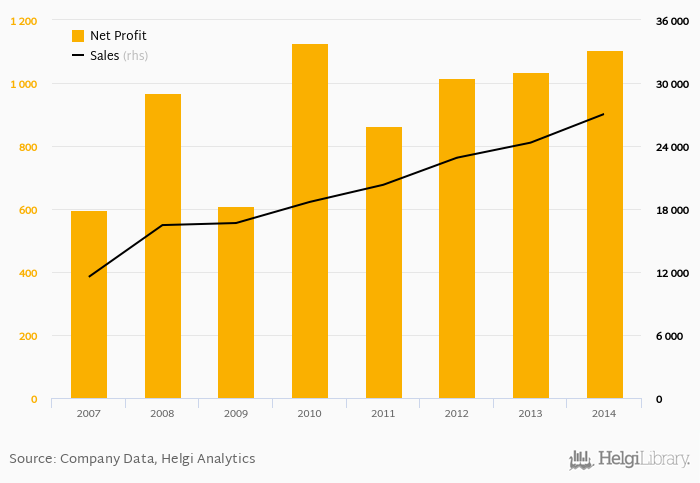 Sales have grown by 10.2% a year on average since 2009. They reached a high of CZK 27,049 mil in 2014 and a low of CZK 11,534 mil in 2007.