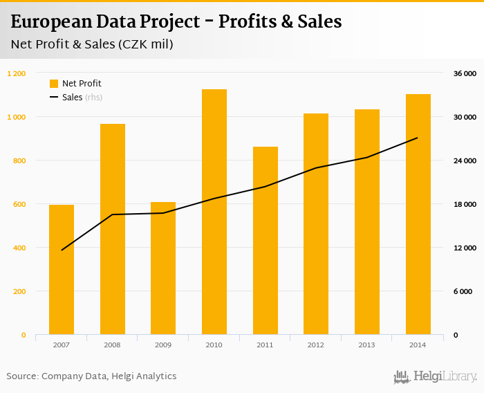 European Data Project made a net profit of CZK 1,105 mil in 2014, up 6.63% compared to the previous year. Total sales reached CZK 27,049 mil, which is up 11.2% when compared to the previous year.